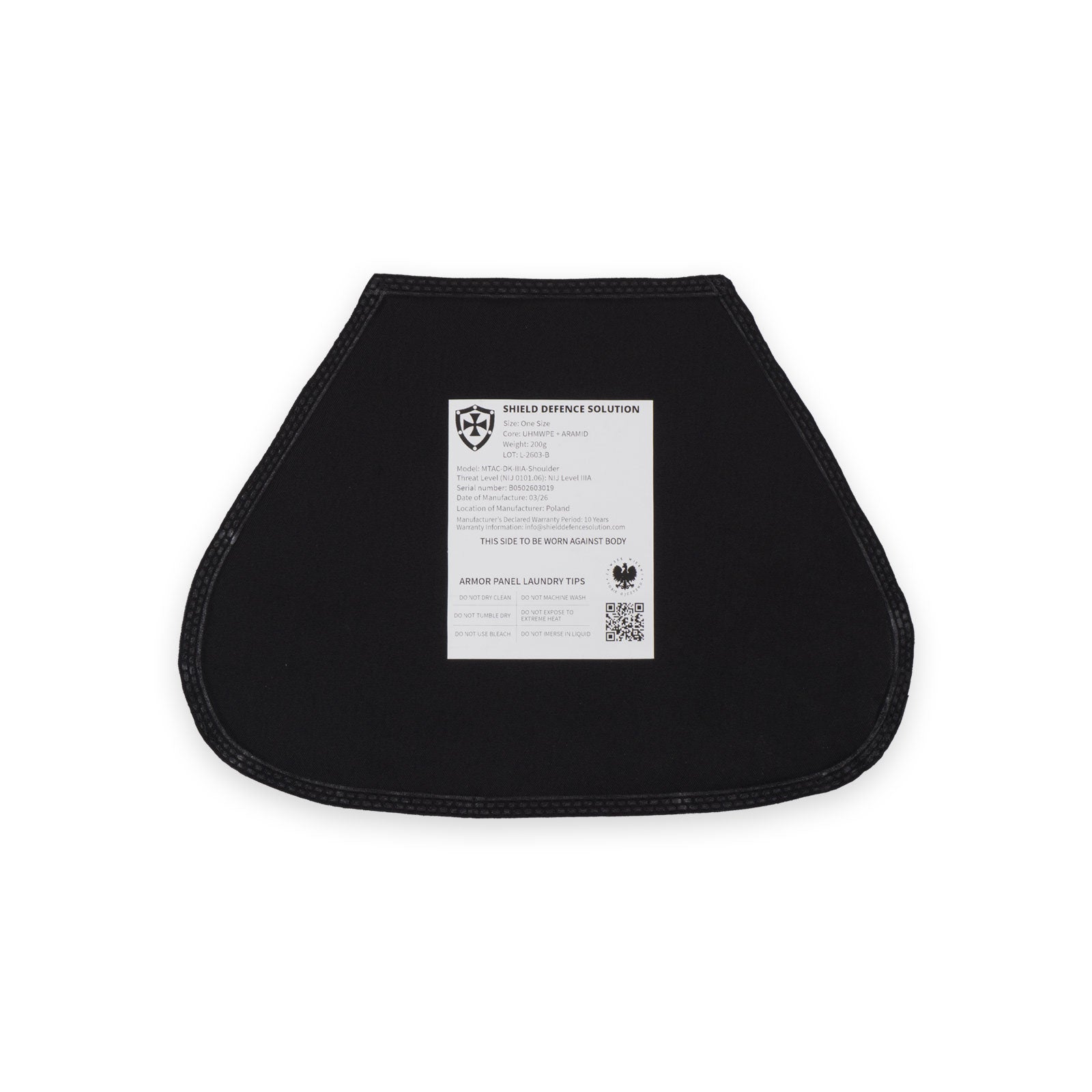 Testowane zgodnie z NIJ Level IIIA (NIJ 0101.06) — zatrzymuje pociski .44 Magnum, .357 SIG, 9 mm FMJ i podobne zagrożenia ze strony broni krótkiej
